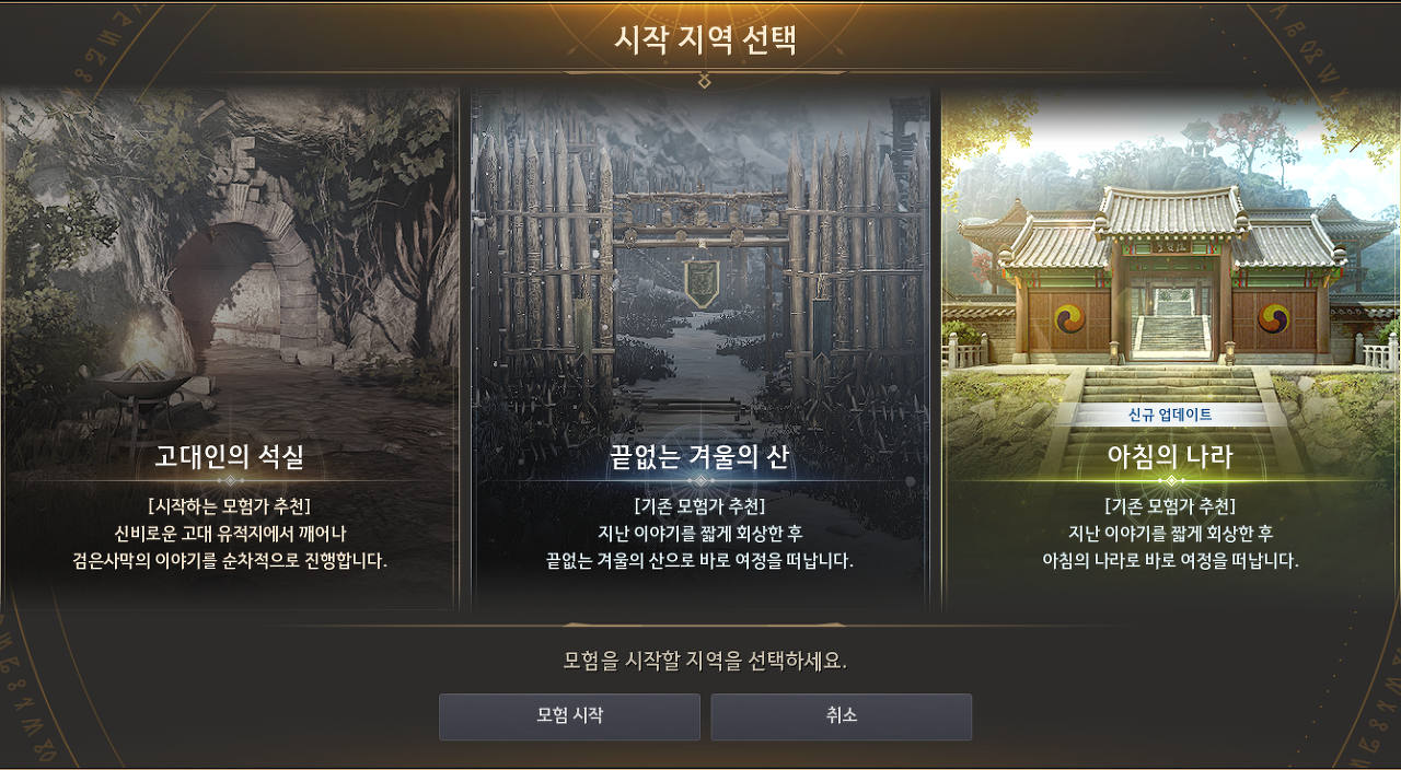 : 일단 시작 지점1(고대인의 석실)을 선택하고 발레노스, 세렌디아, 칼페온, 메디아 메인 퀘스트를 하세요. 스토리는 재미 없을 수 있습니다. 또는 아침의 나라(시작 지점3-추천)나 끝없는 겨울의 산(시작 지점2)를 하셔도 됩니다. 하지만 가문 당 1회는 무조건 발레노스~메디아 메인 퀘스트 1번은 깨는 게 좋습니다. 인게임 컨텐츠 진행을 위해서 입니다.