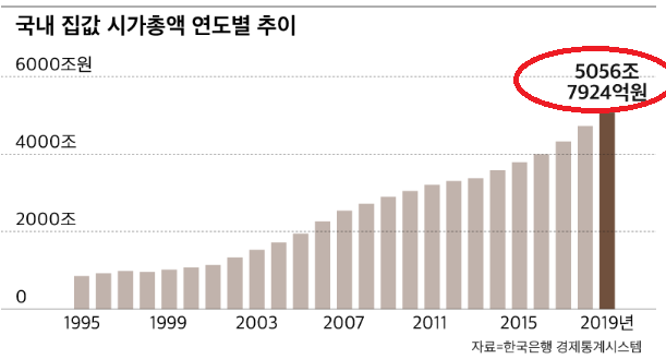 지난해 우리나라 집값의 시가총액이 5천조 원을 넘어섰습니다. 한국은행에 따르면 지난해 국내 주택 시세의 시가 총액은 5천56조 7천9249억 원으로 집계되었습니다. 이 수치는 그 전년과 비교해 7.4% 증가한 수치입니다.