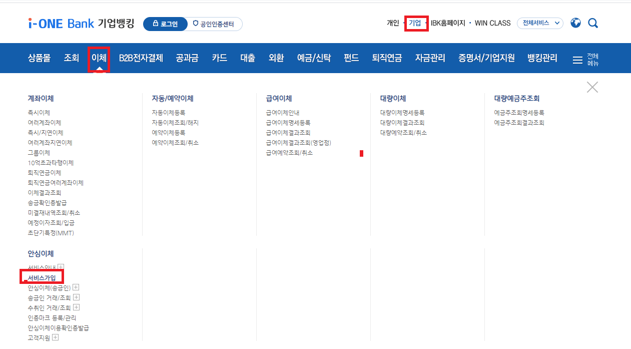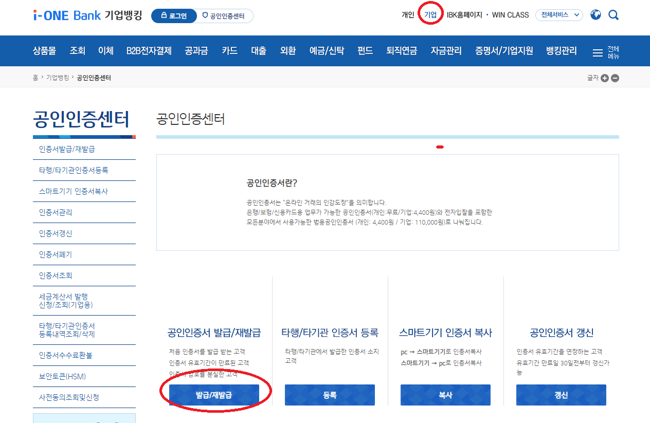 1. 기업은행을 기준으로 ->공인인증센터 -> 기업 ->발급 재발급 클릭