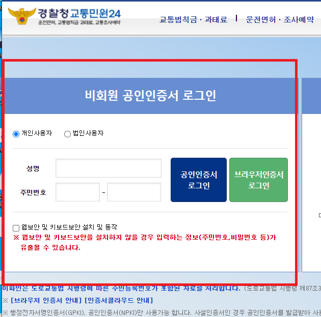 3. 빨간색 네모안에 최근 무인 단속 내역으로 들어가면 공인인증서 로그인이 뜨게 됩니다. 개인정보 사항이 많아서 인증단계가 있습니다. 브라우저 인증이나 공인인증서 인증 중 편한 것을 이용하시면 됩니다.