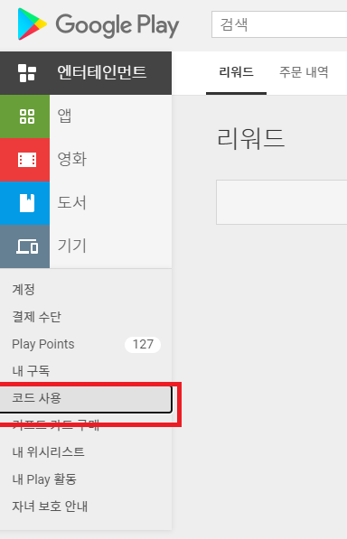 구글플레이스토에 접속 후 로그인 한후 코드 사용을 눌러구글플레이포인트를 충전한다.