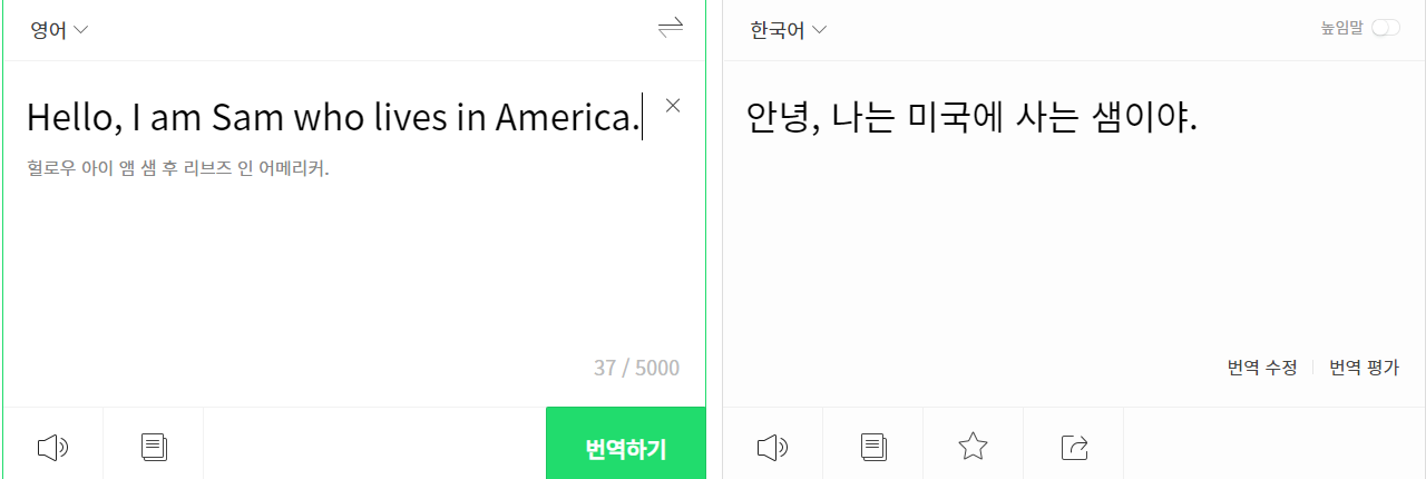 간단한 문장도 해석해주기 때문에 영어회화를 하거나 외국인 친구들과 채팅을 할때 아주 유용하게 사용할 수 있습니다.